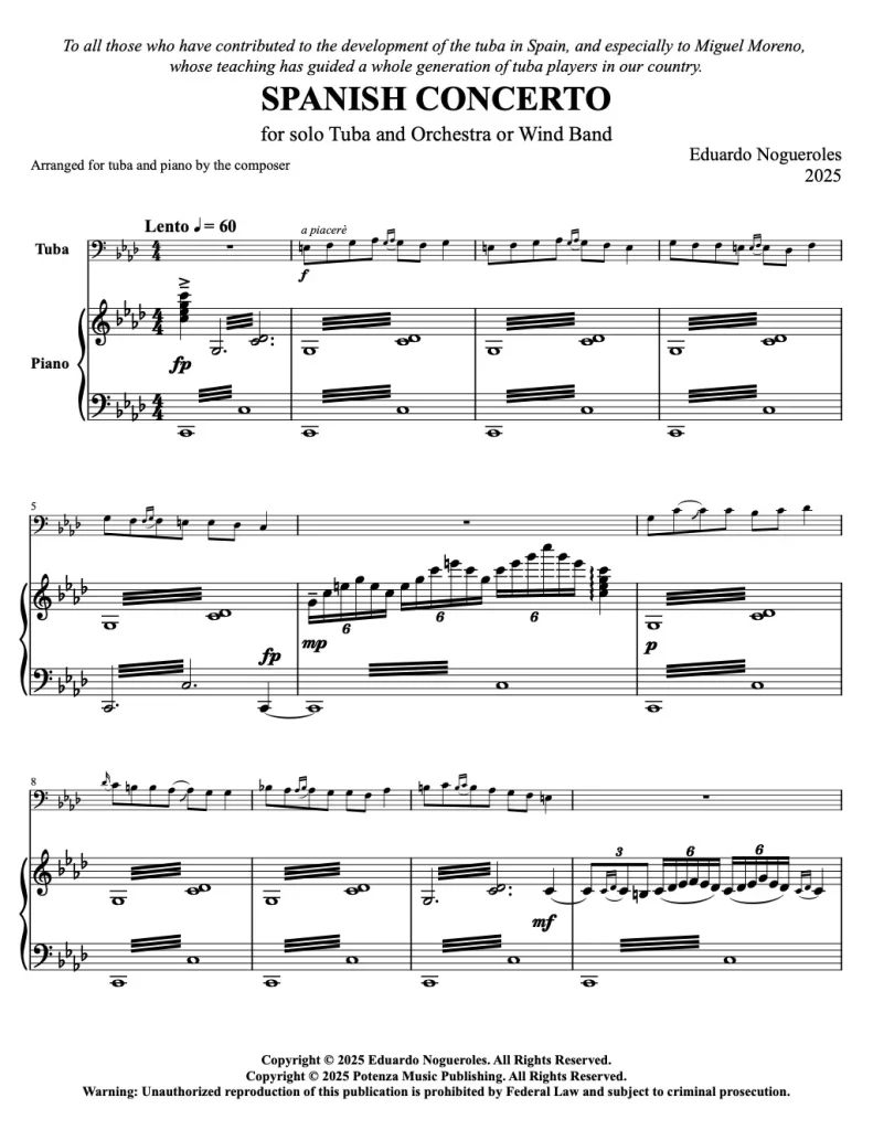 Dedicado a todos aquellos que han contribuido al desarrollo de la tuba en España, y especialmente a Miguel Moreno, cuya enseñanza ha guiado a toda una generación de tubistas en nuestro país, el concierto fue estrenado por el autor como tuba solista, acompañado por la Banda Sinfónica de la Societat Musical d’Alboraia, en la International Tuba and Euphonium Conference ITEC Spain 2025 celebrada en Valencia y organizada por la Asociación Española de Tubas y Bombardinos AETYB.