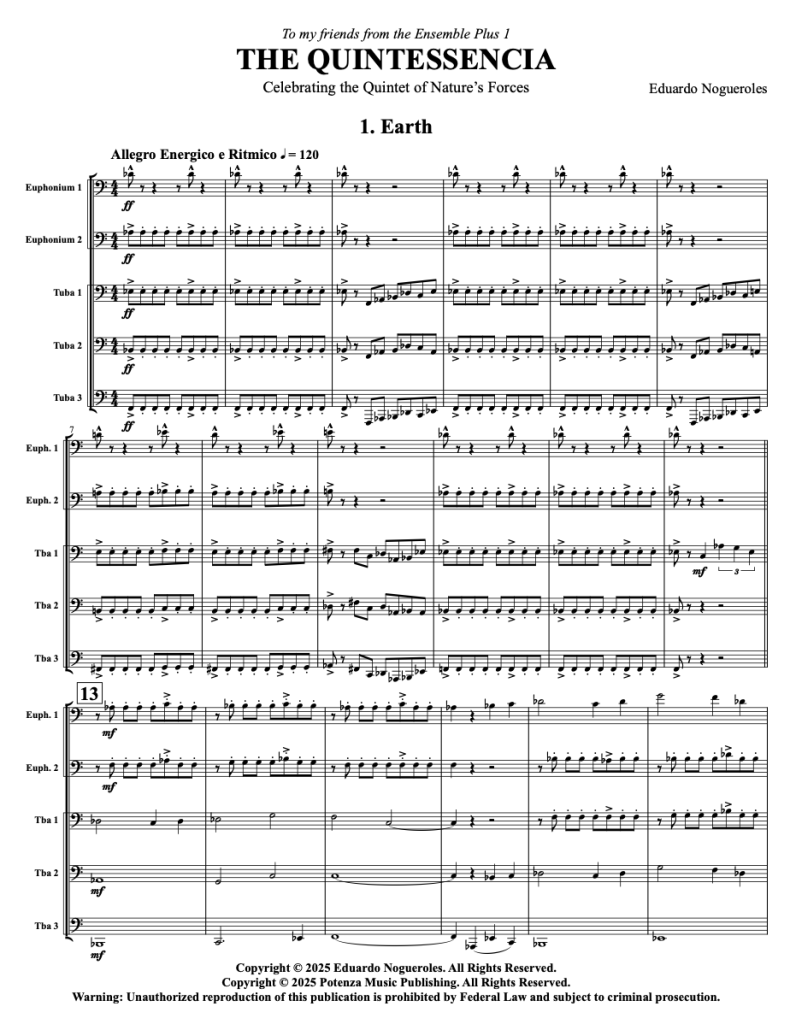THE QUINTESSENCIA (11:30) es una obra para dos bombardinos y tres tubas que celebra las fuerzas de la naturaleza. Cinco movimientos inspirada en los cinco elementos clásicos —tierra, agua, aire, fuego y éter— entendidos como fuerzas fundamentales de la naturaleza y como motores de energía musical.