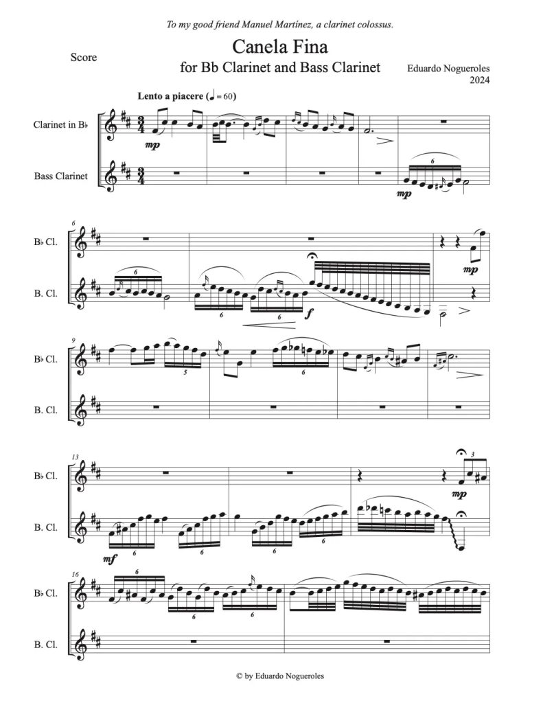 CANELA FINA (3:10) es una adaptación, a petición del coloso del clarineteManuel Martínez, de la pieza del mismo nombre para Bombardino y Tuba. La obra comienza con una cadencia en la que los dos clarinetes dialogan mostrando todo su rango. A continuación comienza una virtuosa bulería en la que opcionalmente podemos incluir el acompañamiento de una batería o un cajón flamenco para dar a la pieza un característico ambiente español.